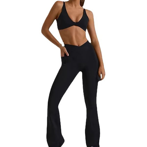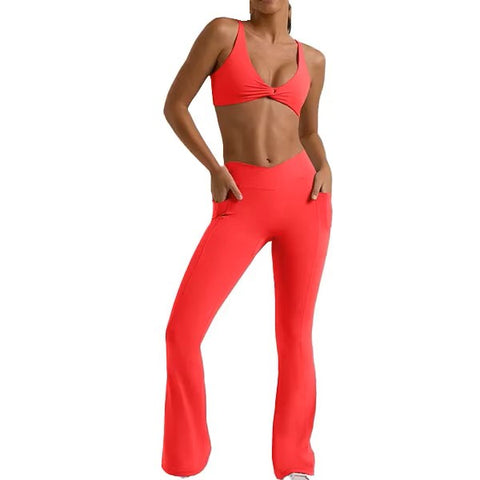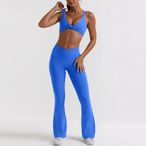Suit Yourself Twist Front Sports Bra With Flared Wide Leg Pants Leggings 2 Piece Set