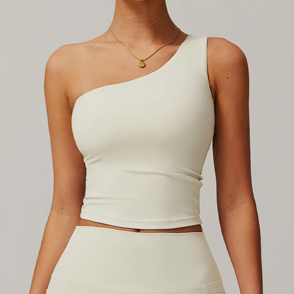 One-shoulder tank top. The asymmetrical design and butter-soft fabric ensure both comfort and chic. Pair it with those comfortable jeans to complete the look.