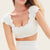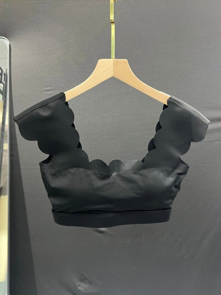 Scallop details: Square Neck Tank Bra Removable push-up pads Medium support Breathable, Eco-Friendly, Reversible, Quick Dry, Four-Way Stretch Made of Spandex / Nylon Runs True to size Colors: White, Orangebrown and Black